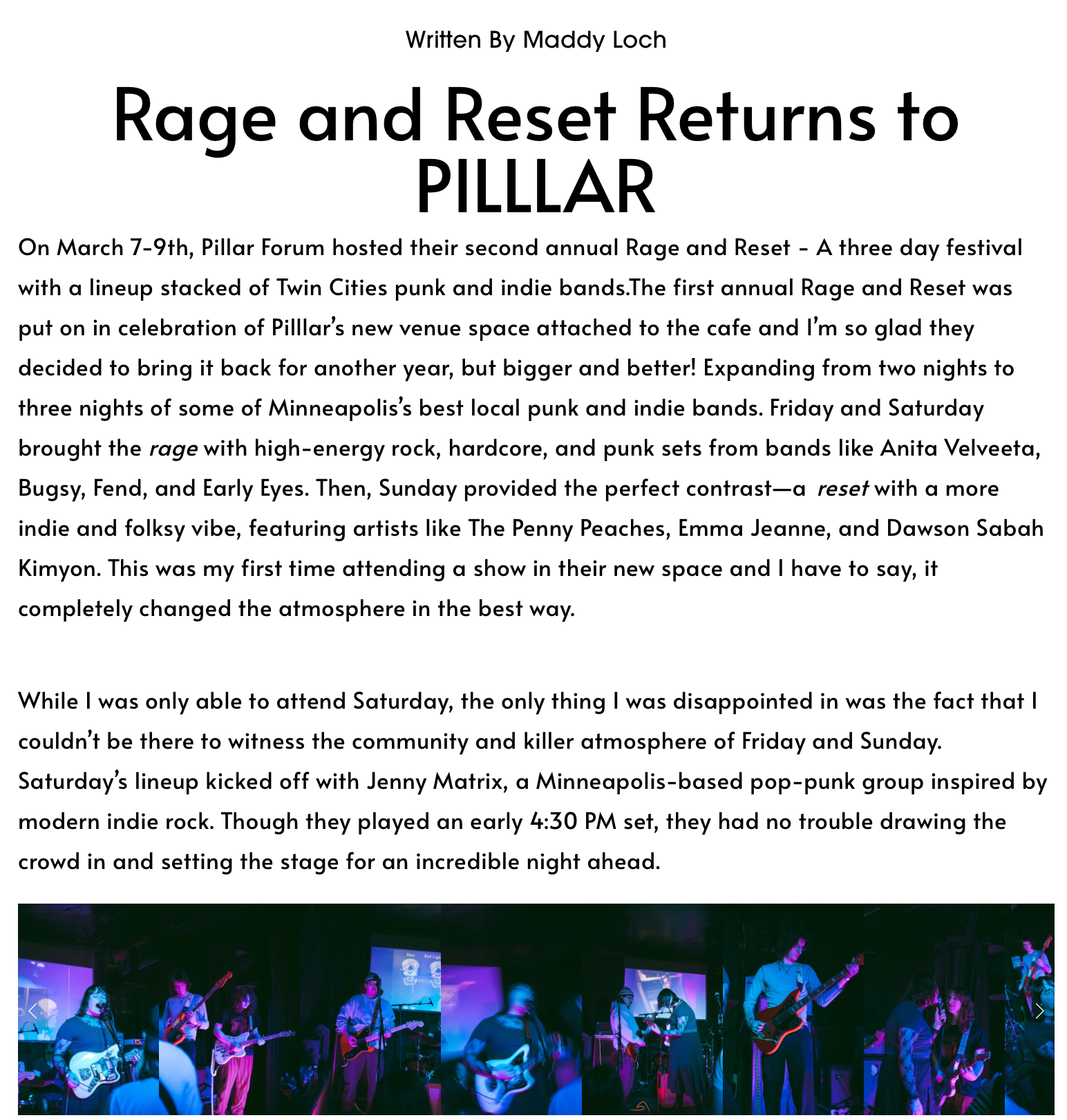 On March 7-9th, Pillar Forum hosted their second annual Rage and Reset - A three day festival with a lineup stacked of Twin Cities punk and indie bands.The first annual Rage and Reset was put on in celebration of Pilllar’s new venue space attached to the cafe and I’m so glad they decided to bring it back for another year, but bigger and better!