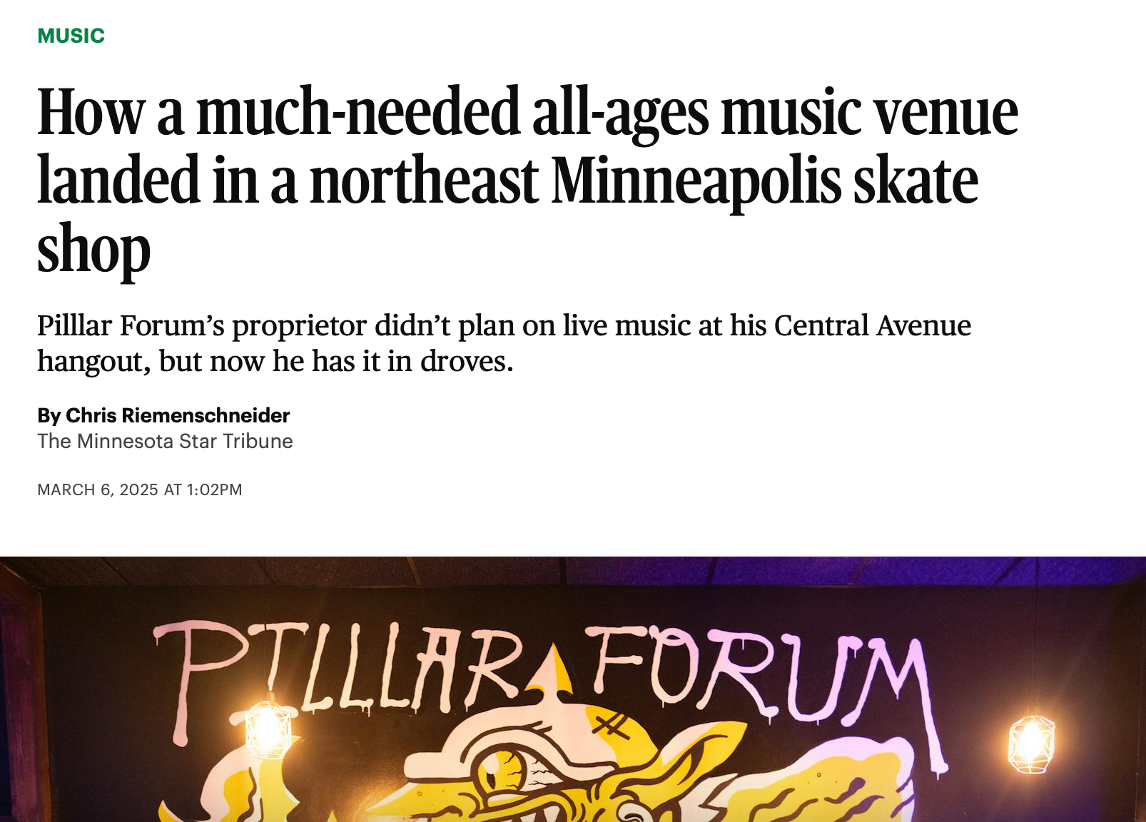 Northeast Minneapolis coffee-slash-skateshop PILLLAR Forum never intended to be a show space; "music wasn't really even on the radar" when they opened last year...